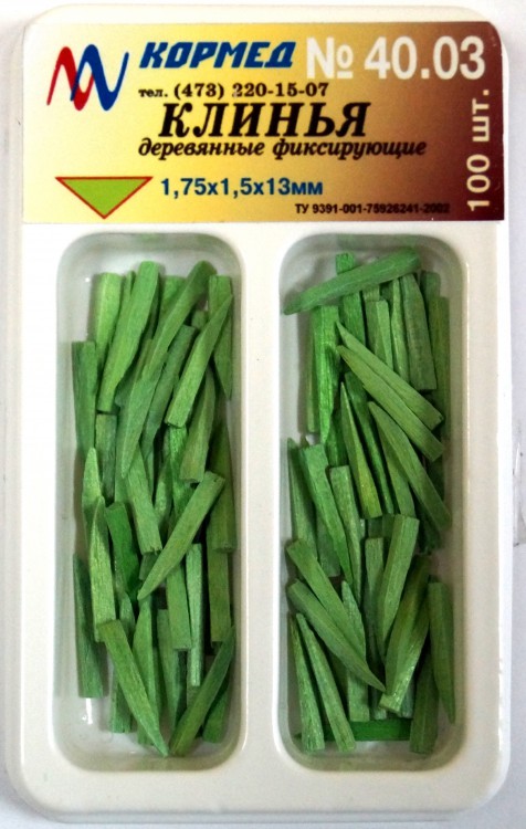 Клинья фиксирующие изготавливаются из твердых пород древесины (береза, клен). Древесина, как природный материал, обеспечивает стабильность и сжатие, т.е. оптимальную посадку в межзубном пространстве. Кроме этого, деревянные клинья впитывают влагу и расширяются.